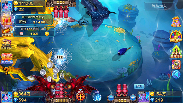 3、正宗街机捕鱼玩法基础上又添新内容,福利更多,炮台更强,画面更酷炫!金币、弹头更易获得!