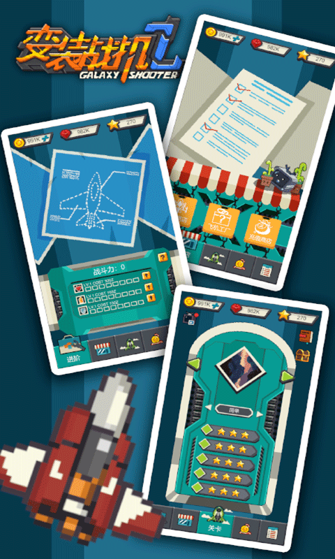 变装战机2银河射击在传统飞行射击玩法的基础上还加入了强化进阶、飞机搭配、飞机生产,以及关卡的难度可自定多方位选项。