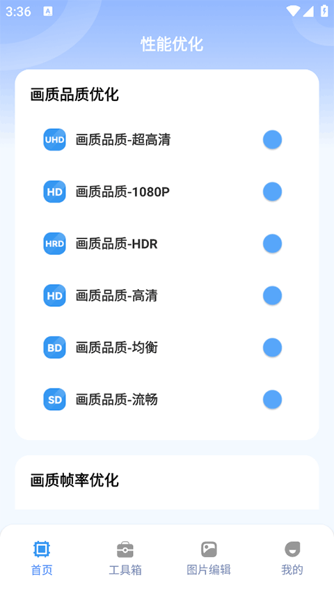 2、在App主界面,根据手机性能选择相关画质优化选项点击