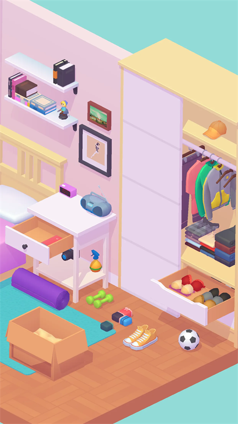 事实上,不同的房间会有不同的家具,适时的将家具柜打开来放置你所整理好的物品。带有自上而下的3D视角让你更容易尝试在不同的空间放置不同的物品,有些时间当物品不在适合放置家具上时可以暂时放置在地板上来存放。简单来说,将杂乱的箱子内物品归纳整理,并根据物品的尺寸、属性,放置在合适的位置,看着整洁的房屋,身心愉悦,感兴趣的小伙伴可一定要来尝试下哦~