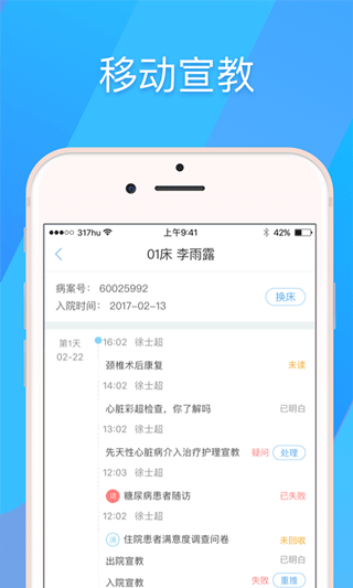 317护app是专为广大医护医疗从业人员打造的一款移动在线护理宣教平台,该平台从医护人员的宣教工作着手,充分利用移动互联网的便捷优势,将传统医疗医护服务完美结合,可帮助医护人员通过移动端3秒完成患者入院登记,将全媒体宣教课程推送到患者的微信端,实现数据精准分析指导与宣教培训全流程闭环管理,将医护人员从重复繁重的日常宣教中解放,极大减轻负担。同时还云集全国护理专家团队,打造海量患者宣教、护士培训课程,创新护理知识共享圈,共同促进优质护理服务。