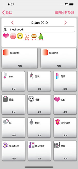 3、预置 100 多种症状,还可选择体重、基础体温、心情、药物使用、性生活、宫颈粘液、图表等更多功能。4、各类日常提醒:月经、排卵、体重、基础体温、综合维生素片、乳房自检、避孕药、避孕环、避孕帖、甲羟孕酮避孕针、宫内节育器。