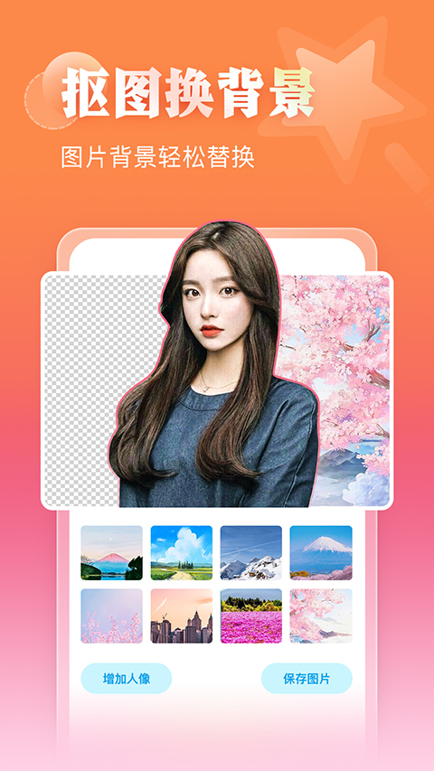 通过人工智能自动识别图片中的人像并实现自动抠图,您可以添加多张人像图,还可以直接复制,随意调整人像位置大小,发挥自己的想象力,名人合影、隔空合照变得轻而易举