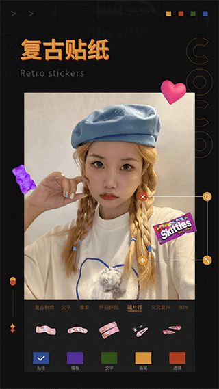 3、这里汇聚了很多复古的贴纸效果,帮助大家添加到图片上,还能让你添加编辑文字哦