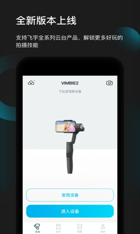 1、打开feiyuon官方最新版,连接蓝牙,有设备、技巧、相册和我的版块;