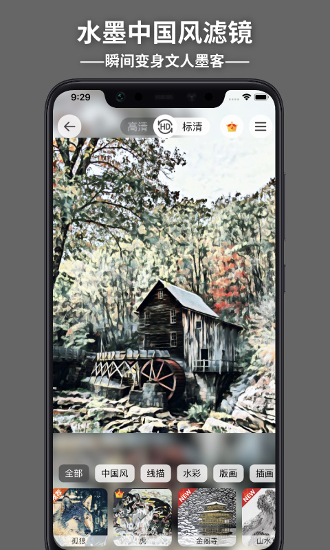 蕴含大量中国元素风格,给你的照片添墨加彩,别致古风笔触,瞬间变身文人墨客,制造一种传统东方美感;