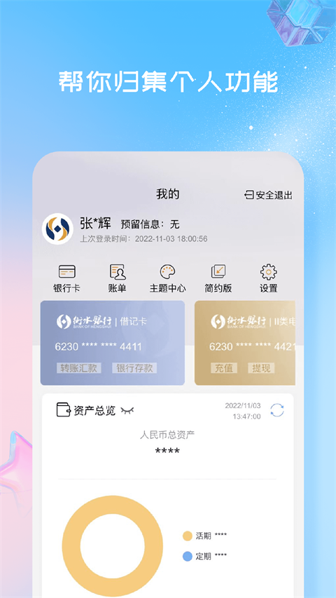 衡水银行app是由衡水银行股份有限公司专为衡水市民推出的一款银行软件,该软件为了给衡水地区的市民带来更好的服务体验,其功能十分的强大,比如说在线转账、跨行转账、话费充值等功能,当然需要注意的是其中的转账功能是需要输入密码或者指纹来进行使用的,这样才能有一定的安全保障,并值得一说的是在软件中进行转账操作是不收取任何手续费用,不过一但涉及到大额的交易,还需要提供数字证书,这样才能更好的提供双重保障享受安全转账。除此之外,衡水银行软件还简单直观的设计风格,优质全面的功能服务,让用户可以足不出户就能在手机上24小时随时办理任何金融业务,只为了给您一个方便的使用体验,有需要的小伙伴快来本站下载体验吧。