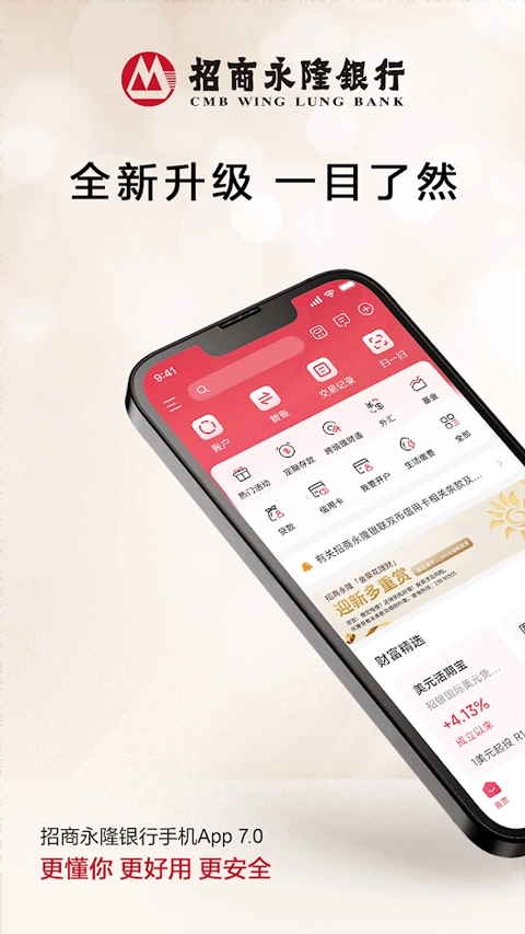 招商永隆银行app是由招商永隆银行有限公司深圳分行所推出的一款手机银行理财软件,通过它用户可以随时随地查看自己的账户,在线进行业务更改,而且还支持转账汇款、贷款、账单查询、信用卡还款、金融理财等多种特色生活服务,让大家足不出户便能办理各种金融服务。另外,软件还十分的安全,用户可通过生物认证功能迅速登录让账户信息更加安全,而且开户时可同步申请开立存款账户和港股、美股账户,无需去指定网点排队等待尽享线上办理业务的便利,更可在线申请办理各种银行业务让你手机理财交易安全掌控,为你提供最优质全面的银行服务。