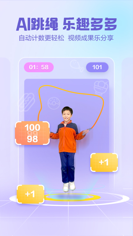 可根据自身需求,选择计数、计时、热量消耗、自由等四种跳绳模式,帮助孩子达到青少年体测标准。自动计数功能让跳绳更轻松,还能将视频成果分享给朋友们。更有节奏钢琴、小橙酷跑、躲进盒子、音乐星球等多种运动形式,趣味无穷。
