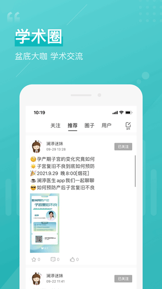 澜渟医生还设置了一个学术圈,里面包含了很多丰富的医学知识资料,用户可以关注盘底领域的专家,了解这方面的相关知识。