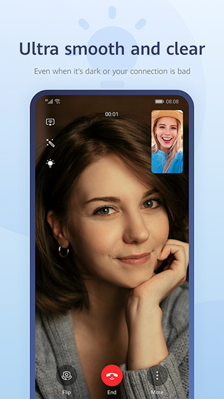 华为畅连app是一款拥有华为设备(如手机、平板、智慧屏等)的用户专有的社交软件,该软件可以让拥有华为设备的家人、朋友、进行高清视频或语音通话,还可以随时共享屏幕。而且软件还采用了GPU Turbo技术,在网络不佳时,自动提升视频画质。通过智能算法,即时在夜晚或者是弱光的环境下进行视频通话,也能保持人脸清晰可见。视频通话过程中还能随时调整美颜效果。