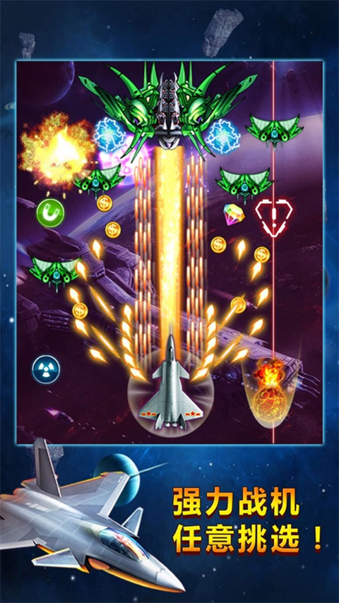 自动吸收掉落的道具,金币及宝石,让你全神贯注打飞机。