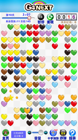 在规定时间内,点击空格,只要是十字线能连接到的相同颜色的心形图案,就能被消除并获得分数奖励。如果点击后没有能够消除的心形图案,会被扣除时间。