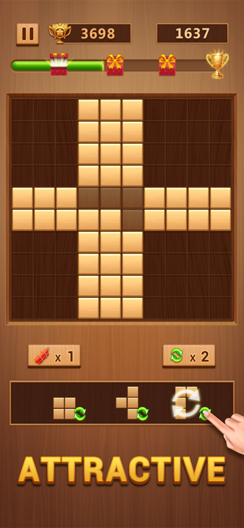 把木块放在板上,试着把它们全部放在一整行或一整列中,木块会被消除一整行或者一整列并且你会得到分数。如果木块会消失,腾出空间放新的木块。如果网格下方没有任何位置可以放下方指定的方块,游戏将结束。
