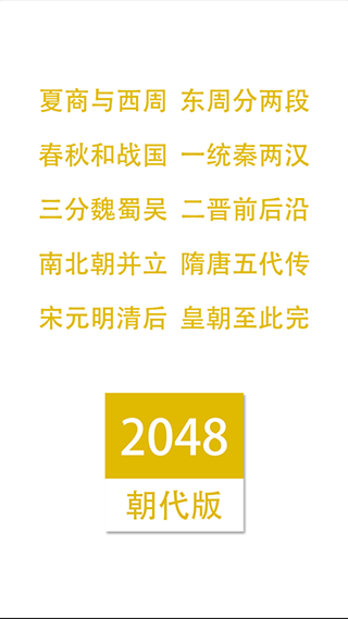 2、2048中国历史朝代经典版:夏->商->周->春秋->战国->秦->汉->三国->晋->南北朝->隋->唐->五代十国->宋->辽->西夏->金->元->明->清->中华民国->中国