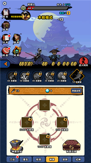 刀法残卷问题:只出1段(不为什么,只因为不用宝石,再升级也只有那么点收益,跟不上你推关卡的速度) 。注:只升最后那个没有名字的刀法,因为没新的刀法了。