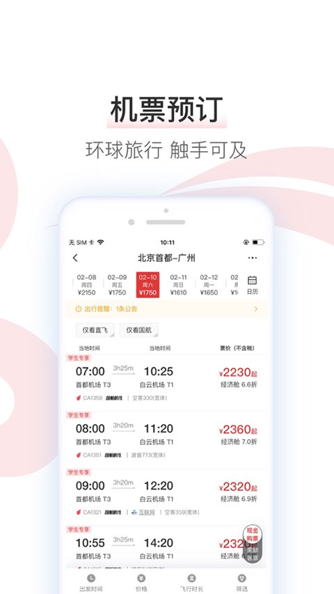 1、涵盖各大航空公司的丰富票源,价格实惠可靠。
