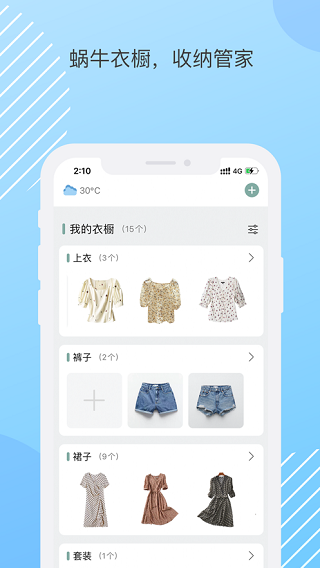 3、衣物分类很方便,拍照导入衣橱,不同的衣物都可以清晰的分类展示出来