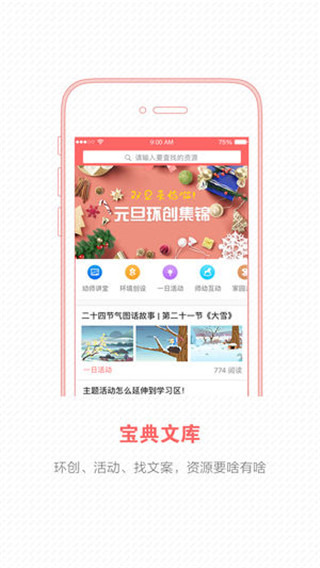 幼师宝典ios版是专为广大幼师群体打造的一款优质教育资源共享平台,该平台整体界面设计清新简洁,UI图标细腻美观,且运行流畅、操作便捷,内置海量优质的幼儿教育资源,涵盖环创、教案、健康安全、教师文案、经验、素材等多个分类,能够全方位满足不同阶段幼师对于幼儿教育的发展及学习要求,更直接更灵活更高效的帮助她们解决在工作、生活中遇到的各种问题,提高工作效率。而且幼师宝典还精选超多精美的人气礼品,可让幼师在学习的同时赚取相应的积分用于兑换,是不是很心动呢,赶快来下载吧。