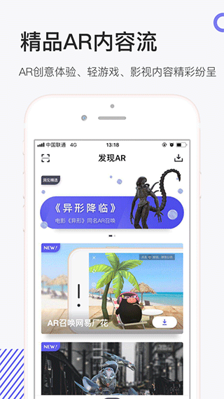 网易洞见AR ios版是由广州网易公司推出的一款三维AR应用,该应用高效结合国内领先的AR引擎与移动互联网技术,提供具有无需标识、真实感渲染、稳定跟踪、互动性高等特殊的一站式三维人机互动以及实物互动交互服务,能在不同场景、不同设备及物体上呈现出可任意触控的互动娱乐生活空间,直观清晰的体验各种奇趣AR体验,用户可以添加各类有趣好玩的动漫影视主角形象,轻松打造虚实合一的震撼视觉作品,让您真切体验亦真亦假的奇幻视觉盛宴~