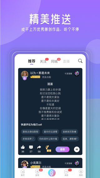 想撩声音好听的小哥哥小姐姐?闪歌的音乐社交属性,让你与男神女神近距离接触!创作的神曲无人欣赏?邀请微信、QQ好友上线聆听,收获一波赞美吧。