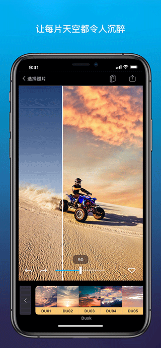 在几秒钟内变换天空(桌面编辑器要花上几分钟的时间!)。从令人惊叹的黎明光辉、正午活力、鲜明日落与沙漠之夜等天空效果中选择。将上面的天空著色并进行颜色匹配,增加云层,或者彷彿微风吹拂那般移动。