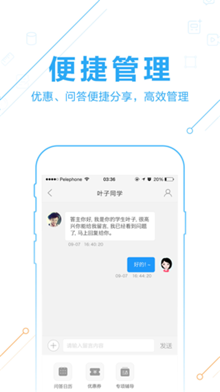 3. 留言互动:实时查看、回复学生留言,支持向学生发送问答日历、问答信息等链接,管理学生更加方便。