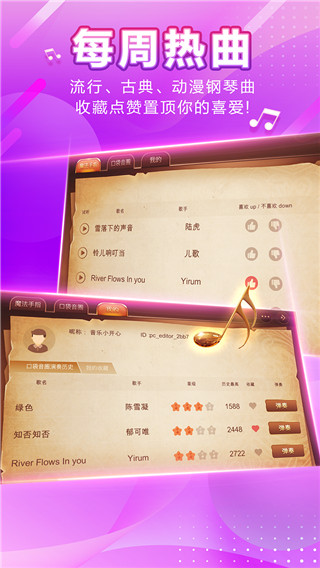2、一键点赞收藏喜欢的钢琴曲,随时随地都可以便捷查找,便捷的练习喜欢的歌曲;
