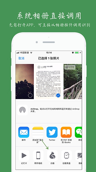 3、支持系统相册插件识别,无需打开 App 即可快速完成识别;