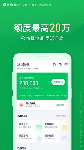 360借条苹果版是360金融旗下旗下打造推出的一款线上纯信用贷款服务平台,该平台依托360集团先进的互联网安全技术及大数据技术,打造了基于海量用户信用数据及行为数据的个人信用体系,能根据不同用户的信用风险、支付习惯、消费情况等综合数据信息考量,授予用户500-20万不等的消费额度,全方位帮助信用资质较好的个人借款客户获得金融机构提供的低成本贷款,降低借款人在消费信贷领域的融资成本。而且360借条全程线上申请贷款,操作简单便捷,无担保免抵押,只需简单几步即可快速锁定用户真实身份,获得相应现金款项,带来更加简单方便、灵活快捷的线上借款新模式。