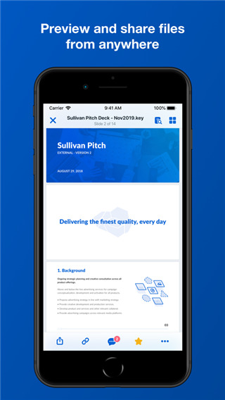Box网盘是一款非常专业的移动网盘工具,而该版本全面支持了ios和ipad两大平台的使用,方便用户更好操作,同时本次小编为用户们带来的是Box网盘ios版,该版本是专门为苹果用户随提供的,同时普通用户注册登录可直接享受50G的云储存服务,通过多年的经营运作,Box网盘在保密、安全方面也是毋庸置疑,感兴趣的朋友可以尝试一下。