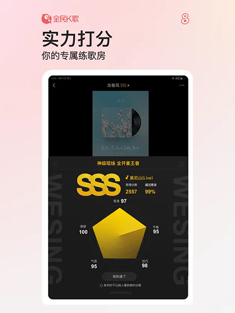 全民k歌ipad版是由腾讯官方为苹果平板设备用户推出的一款在线k歌软件,一般又俗称为全民k歌苹果平板电脑版,拥有海量高品质伴奏曲库,全网新歌热歌一网打尽,你想唱的这里都有,并且唱法还很多样,快唱、朗诵、清唱等等唱法可以随意选择。同时用户不仅自己独唱,还可以通过该款软件与天南地北的朋友唱同一首歌,更有可能与明星同框出演。另外软件所自带的直播功能,将好看、好听、好玩的人都汇聚在这,给大家带来不一样的精彩才艺表演,如果你自己也有不错的才华也能通过该平台让自己当主播,和平台其他优秀的主播们跨房间PK,让你随时随地轻松创作,让你的舞台被全世界看见。