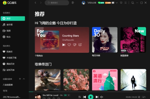 1.用户完成软件安装后,可在桌面双击快捷方式启动程序。进入主界面后,系统会向用户智能推荐各类精选歌单、热门专辑及流行歌曲。用户既可选择推荐内容播放,也可通过搜索功能查找特定歌手或歌曲名称进行收听。