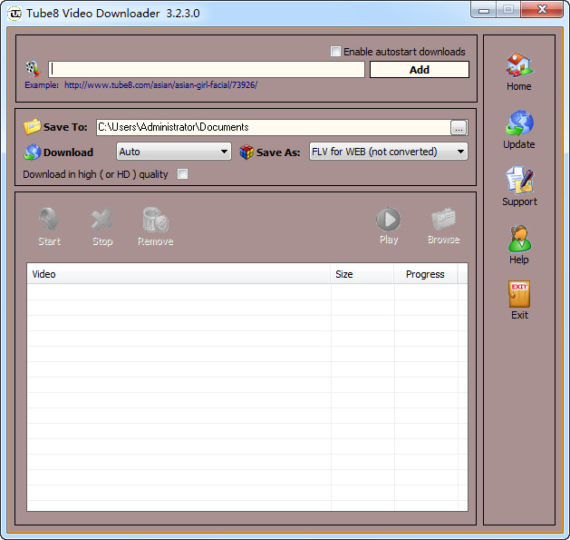 首先下载tube8中文版,并安装,安装很简单双击运行,按照常规安装方法一直安装直到完成安装,进入主界面后,只需把视频的url地址粘贴到本程序里,并选择保存位置和保存格式(AVI, MPEG 或FLV ),视频就会自动下载到指定的文件夹中。
