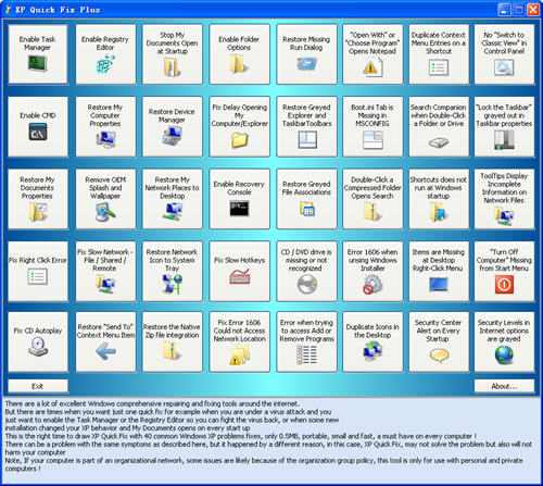 XP Quick Fix Plus是为Windows XP量身定做的,收集了5*8=40个常见XP故障修复小工具,集中显示在一个界面,点击相应的图标,即可修复相应的系统故障。软件虽为因为,但都不难,很简单,下面还有一些解释。XP Quick Fix Plus是一个整合了可以修复XP系统常见的40种问题的免费软件。当使用Windows操作系统的过程中出现问题,使用XP Quick Fix Plus可以修复那些无法使用的功能或各种症状快速修复各种疑难杂症问题。