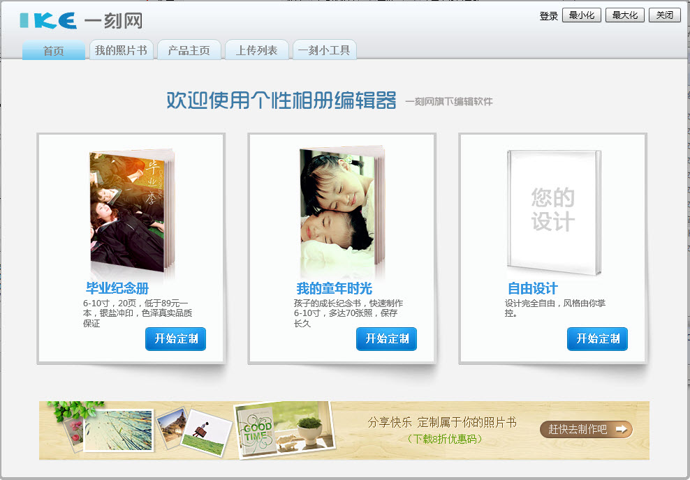 一刻网照片书(相册、个性画册)编辑制作软件2.0绿色免安装版软件是一刻网旗下照片书制作、个性相册编辑、画册制作软件,可以让您快速、便捷的把数码照片制作成实物照片书,是您制作毕业纪念册、家庭照片书、儿童成长纪念册的好帮手。