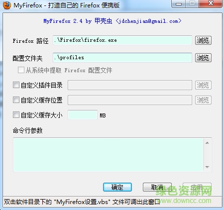 将 MyFirefox.exe 放在任意文件夹,如 D:张三的Firefox 或 D:李四的Firefox。 运行 MyFirefox.exe,正确设置 firefox 路径、配置文件夹等,按 “确定”。 以后双击 MyFirefox.exe 即可直接启动指定配置的 Firefox 浏览器。若要重新设置,可双击软件目录下的 “MyFirefox设置.vbs” 文件调出设置界面